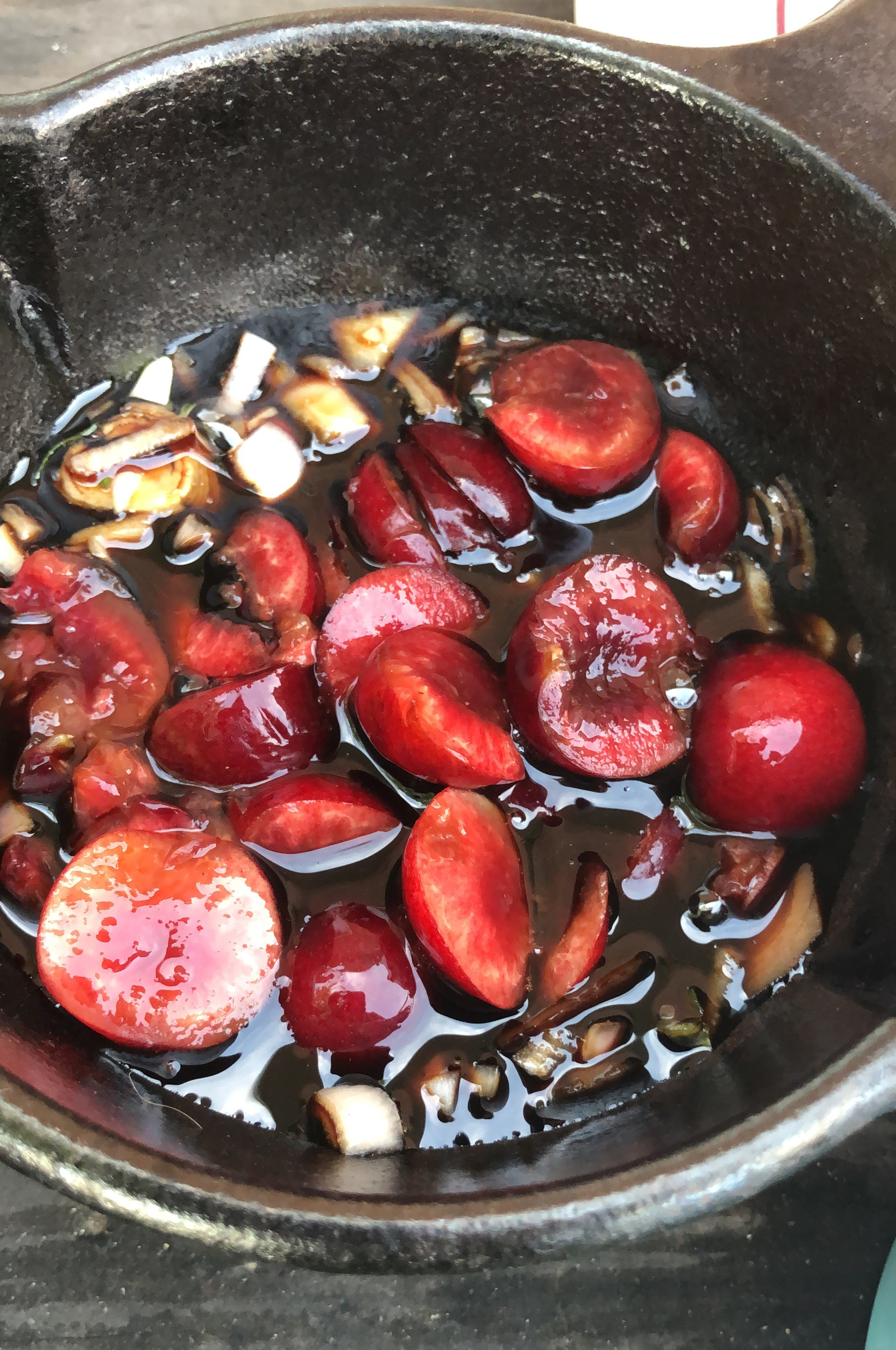 - Combine the Black Cherry Balsamic, cherries and shallots in the cast iron melting pot and simmer to reduce.