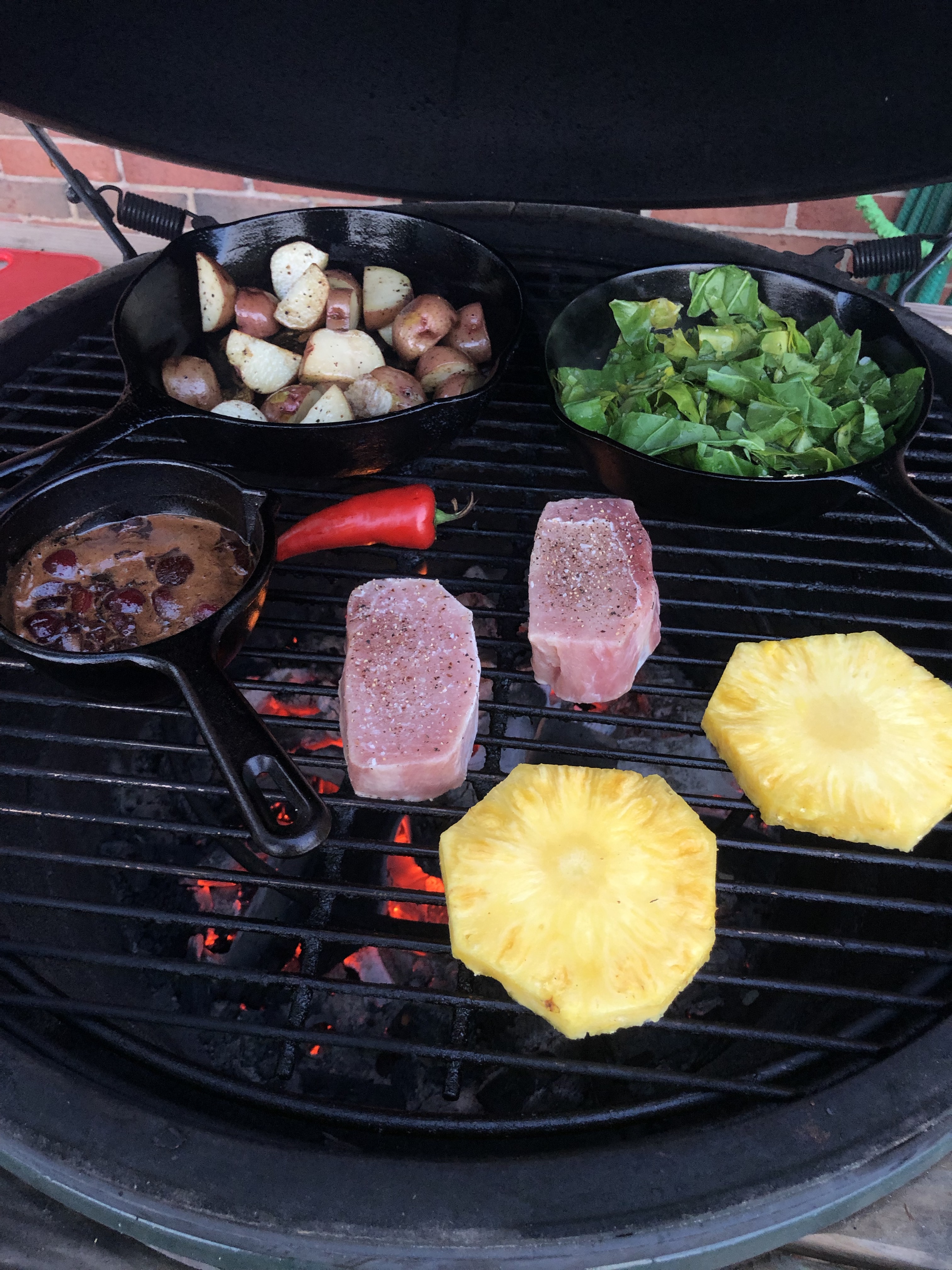 I would describe this meal as a grilled pork chop served over grilled pineapple and a bed of collard greens topped with a cherry balsamic reduction. So, where does the heat come from? A grilled red hot chili pepper, of course!