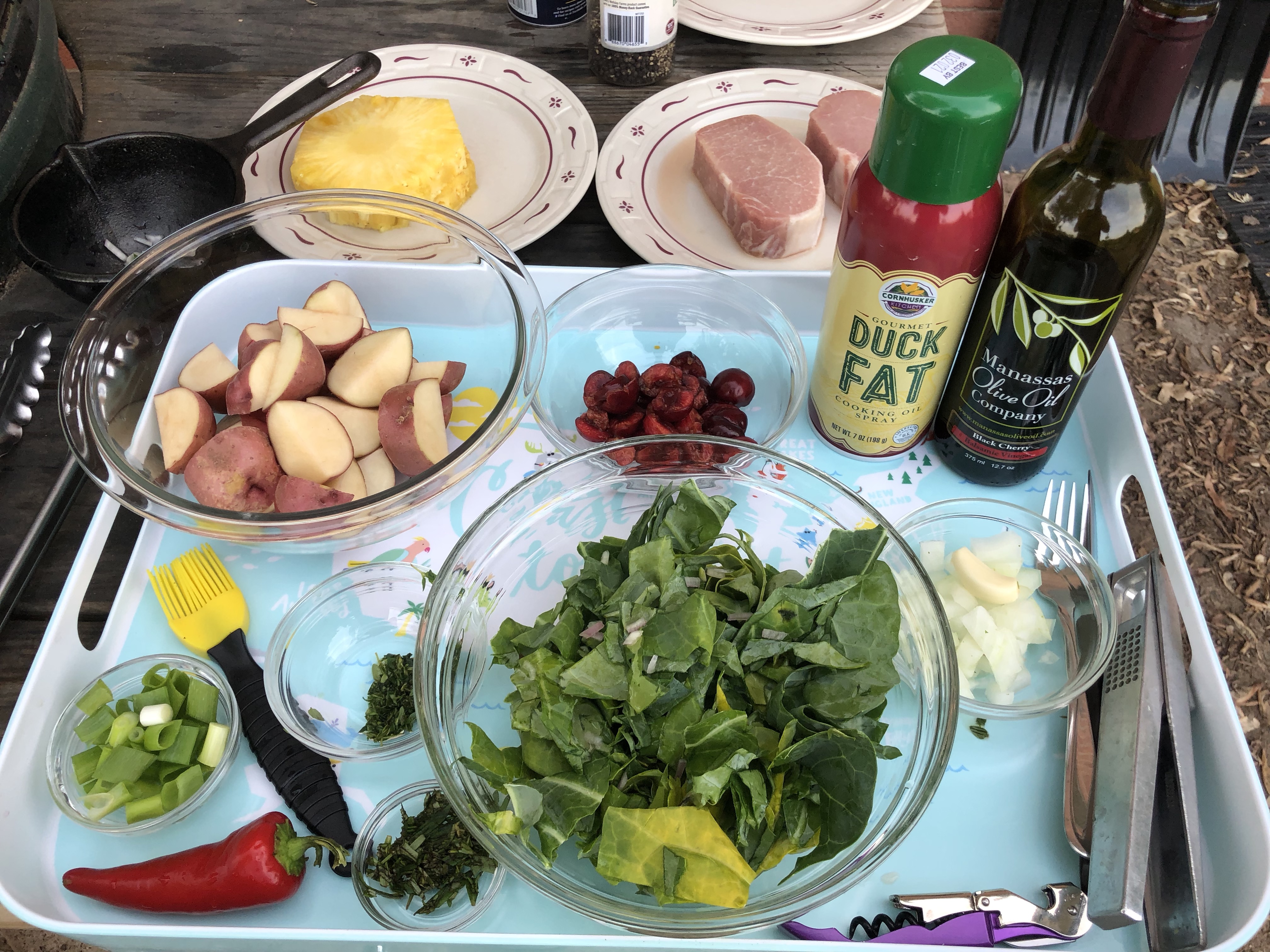 - While waiting for the grill to get to temperature, wash and slice the potatoes (season with kosher salt and pepper), prepare the cherries, wash and chopp the greens (go ahead and add a splash of apple cider vinegar with some salt and pepper), prepare the herbs, and slice the pineapple (see the picture above).
