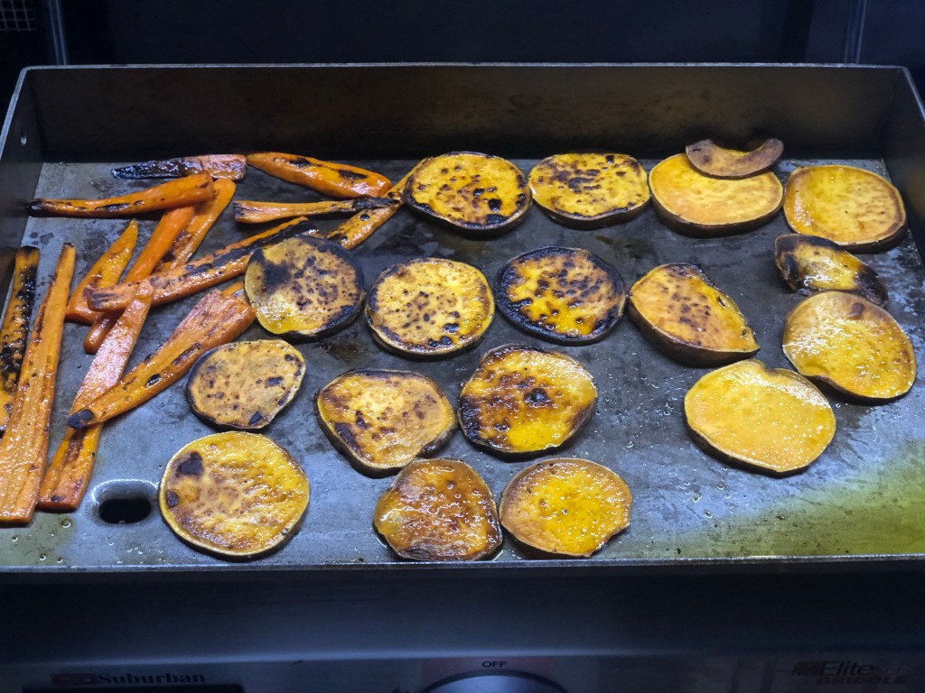 With a warmed griddle, I drizzled some olive oil on the griddle and let it shimmer before adding the carrots and sweet potato slices. I sprinkled some salt and fresh pepper over them.