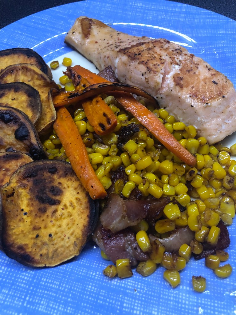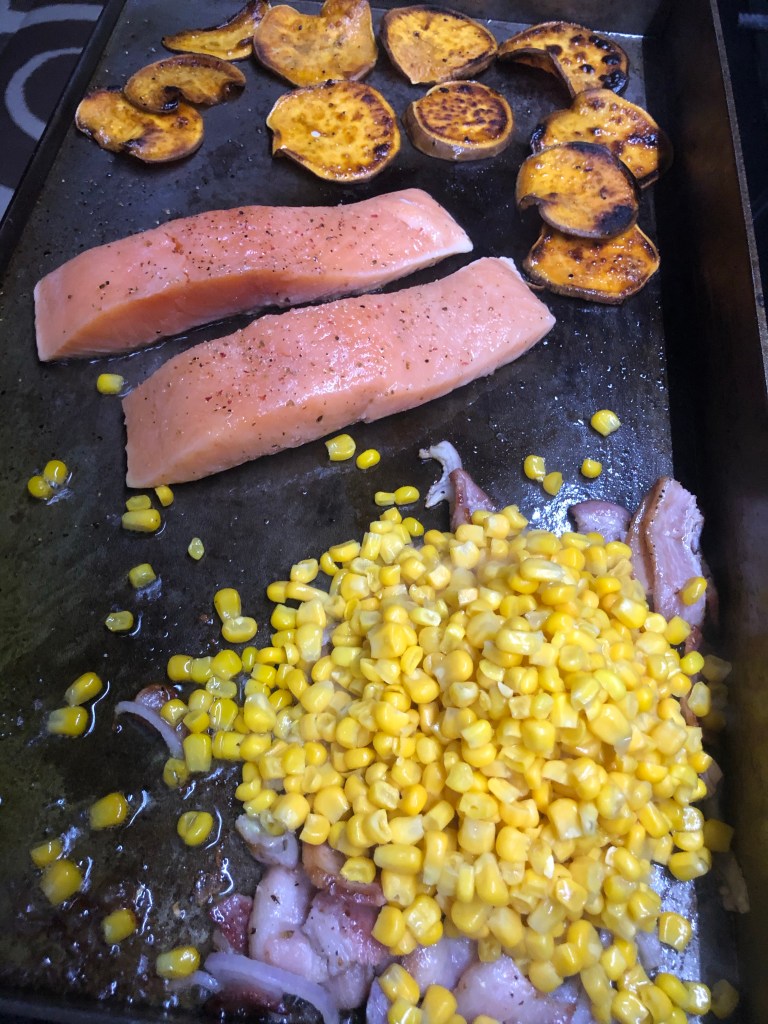 We’re nearing the end of our trip so I wanted to use what we had on hand: salmon and frozen corn from Heartland Home Foods, carrots, a sweet potato, bacon, half of a shallot, olive oil, salt, and pepper. That’s it. No fancy spices or difficult techniques. Just good, fresh food and a griddle outside.