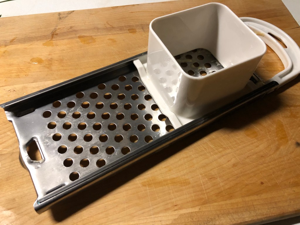 The recipe below really needs more water so the dough is a bit thinner and can more easily flow through the holes. If you don’t have a spätzle maker (shown below), you can also use a colander with large holes.